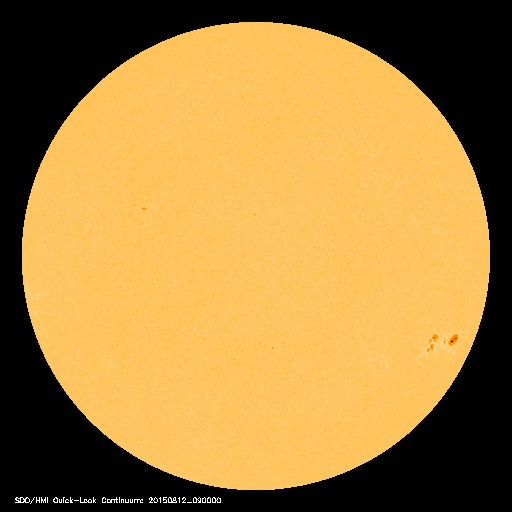 12 agosto 2015: Ripresa in HR del Sole Durante la sessione osservativa nella giornata dedicata al Sole: "Occhi sul Sole 3" è stata acquisita questo bellissimo dettaglio della superficie solare. La zona ripresa è la regione attiva NOAA 12396 ed è localizzata in S18W65 (alla data 12-Aug-2015 23:35 UT). Comprende circa 35 spots su di un'area di 4.5 milioni di km quadrati (fonte NOAA). Riportiamo, per confronto, l'immagine ripresa dal satellite SDO/HMI (le immagini sono orientate in modo differente!) I dettagli di ripresa sono indicati nell'immagine. |