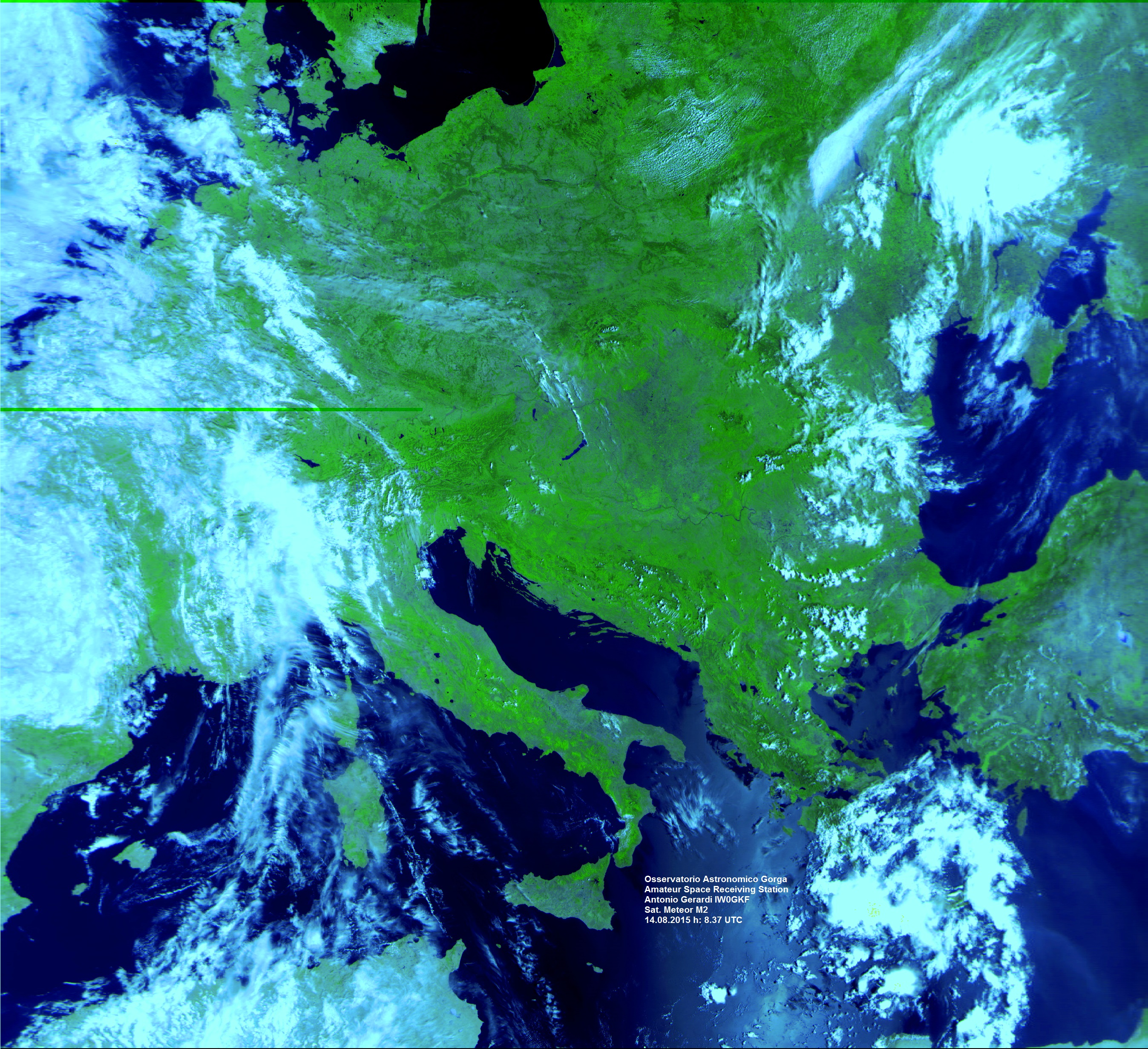 14 agosto 2015: Altra immagine in HD dell'Italia Nuova spettacolare immagine del satellite meteorologico russo Meteor M2 in alta definizione. Salvo una densa nuvolosità nelle regioni nord occidentali, l’Italia si presenta sgombra da nubi, rivelando particolari interessanti. A nord est si vedono chiaramente dettagli delle Alpi orientali, scendendo al centro si notano i laghi a partire da nord: Trasimeno, Bolsena, Bracciano, Albano e si individua chiaramente la piana del Fucino. Al sud si può distinguere il grande apparato vulcanico dell’Etna la cui sommità si presenta con un colore scuro che evidenzia i prodotti vulcanici recenti che sono totalmente privi di vegetazione. |